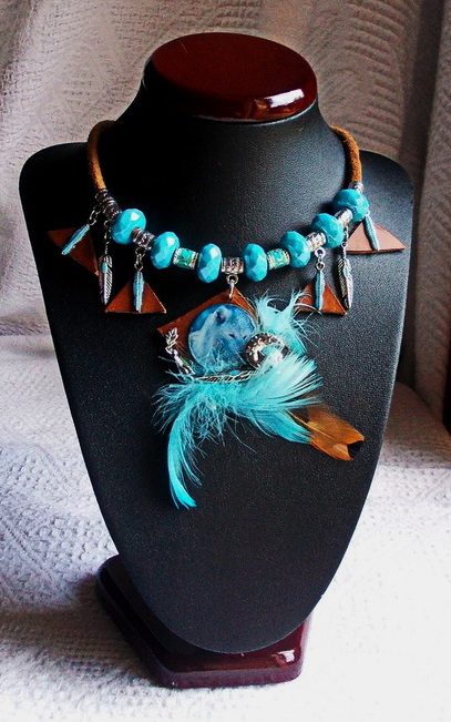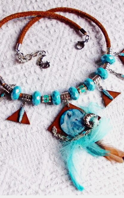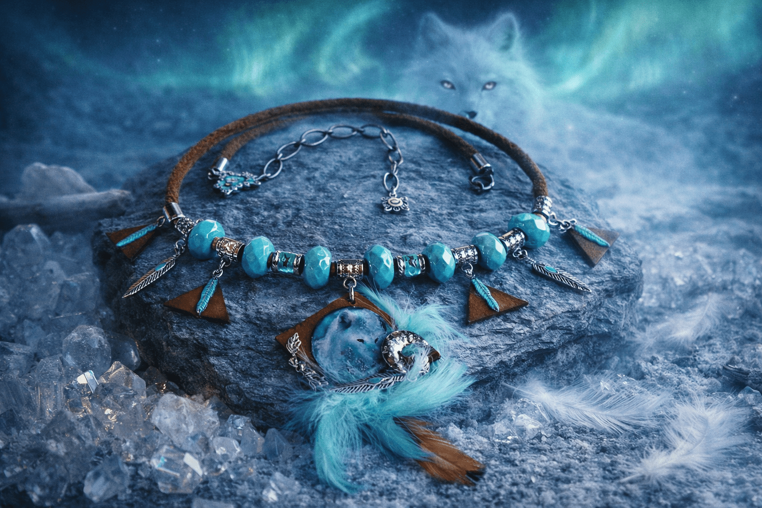 Ce collier est une invitation au voyage chamanique, une ode à la force tranquille et à la liberté des étendues glacées. Au centre, le regard perçant d'une louve blanche se dessine sur un support de cuir brut, entouré de symboles protecteurs : une lune étincelante et des plumes d'argent. Le contraste entre les perles à facettes bleu azur, évoquant la glace, et la douceur des plumes véritables crée un bijou totem d'une grande puissance spirituelle. Une pièce unique pour celle qui écoute l'appel de la forêt et des étoiles.